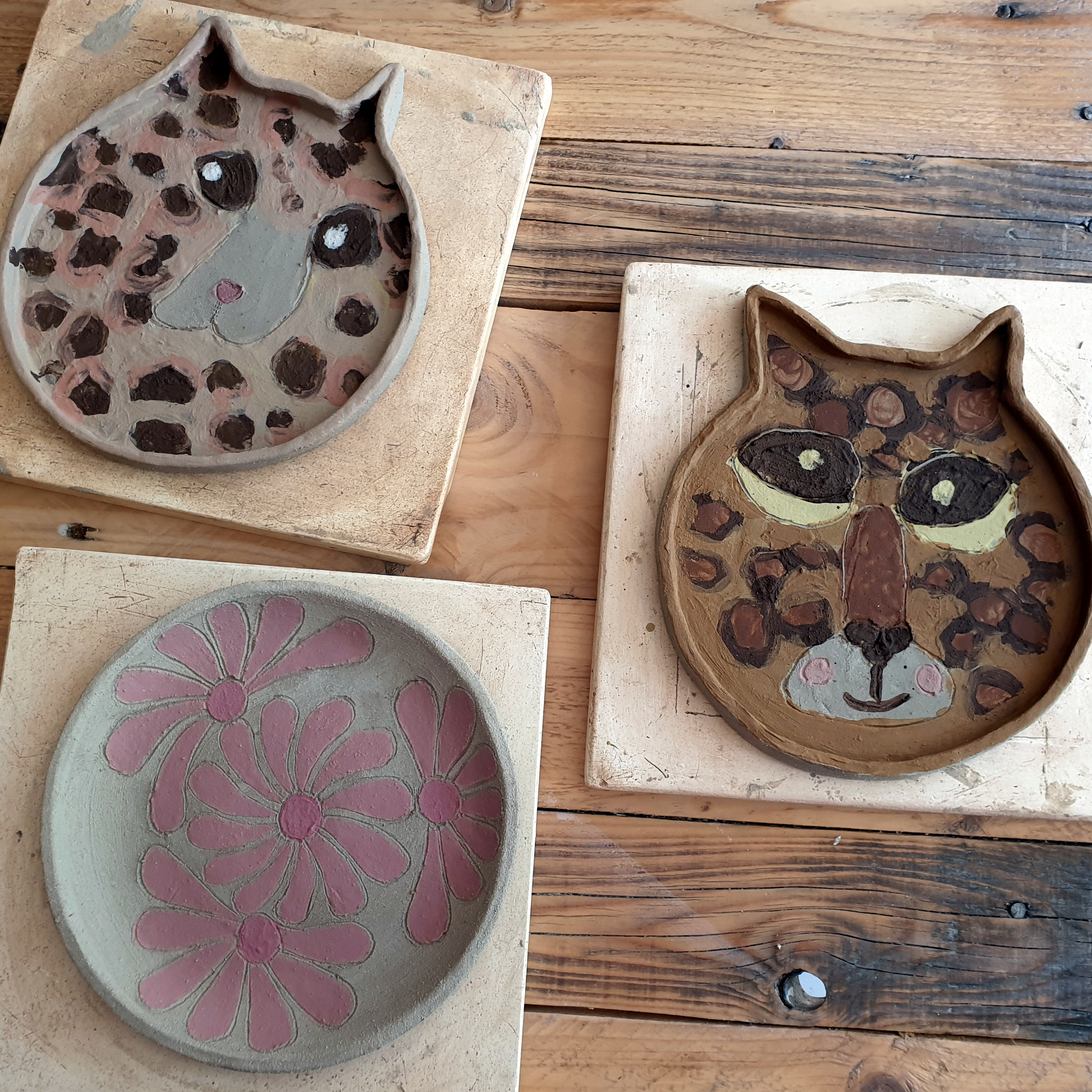 A partir d’argile que vous allez étaler en plaque, vous allez façonner votre assiette en lui donnant la forme souhaitée. Vous pourrez ensuite « peindre » vos pièces grâce à des terres liquides colorées et laisser libre court à votre imagination. Pinceaux, éponges, brosses ou même gravures : à vous de personnaliser vos bols comme bon vous semble. Après la séance, je me charge de faire cuire vos pièces et de les émailler. Nous conviendrons ensemble des modalités de récupérations de vos pièces.